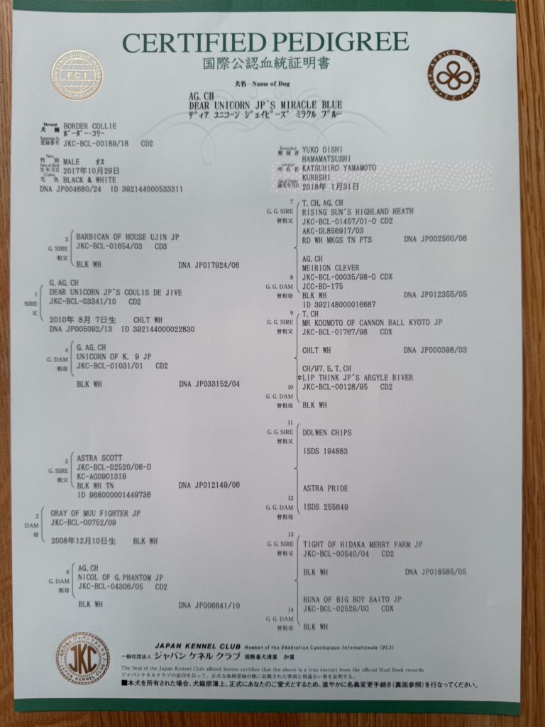 父犬:DEAR UNICORN JP’S MIRACLE BLUE(AGCH)